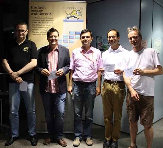 Die Top 5 der FSM 2012 von links nach rechts: IM Erik Zude (5.), GM Igor Khenkin (1.), IM Sven Telljohann (2.), FM Oliver Uwira (3.) & FM Ryhor Issermann (4.)
