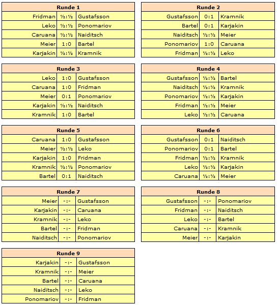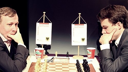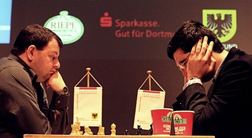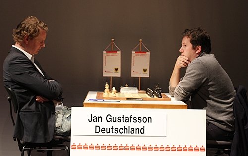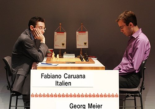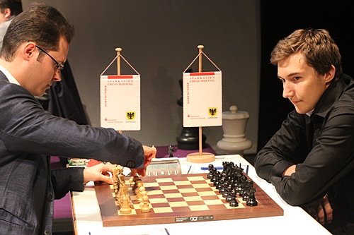 19.07.2012 - Am Mittwoch hatten die zehn Spieler des 40. Sparkassen Chess-Meeting in Dortmund ausschließlich zum Stift gegriffen und zahlreiche Autogramme gegeben, doch heute bekamen sie wieder Holzfiguren zu fassen und versuchten nach Kräften, möglichst einen vollen Punkt zu erzielen. Am besten gelang dies in der sechsten Runde Arkadij Naiditsch und Mateusz Bartel. Die deutsche Nummer 1 hielt sich an Landsmann Jan Gustafsson schadlos und zog so mit Vladimir Kramnik und Sergey Karjakin gleich, welche gegen Daniel Fridman beziehungsweise Peter Leko remisierten. Heraus gefallen aus der Führungsgruppe ist dagegen Ruslan Ponomariov, denn er verlor eben gegen Bartel. Zu guter Letzt trennten sich Fabiano Caruana und Georg Meier in einer spannenden Französisch-Partie friedlich. Die siebte Runde startet am Freitag um 15:00 Uhr.