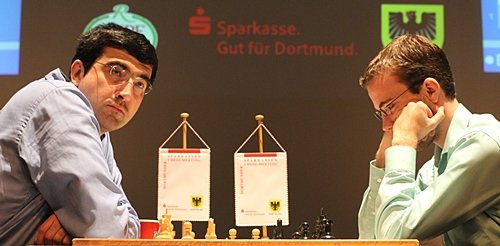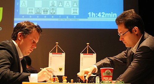 22.07.2012 - In einem Wimpernschlagfinale wurde die 40. Auflage des Sparkassen Chess-Meeting entschieden. Der Sieger heißt - aufgrund der höheren Zahl an gewonnenen Partie - Fabiano Caruana. Der Italiener schlug in der Schlussrunde Mateusz Bartel und hätte somit nur noch von Ruslan Ponomariov oder Arkadij Naiditsch abgefangen werden können. Doch Beide kamen gegen Daniel Fridman beziehungsweise Peter Leko nicht über ein Remis hinaus. Zwar siegte parallel Sergey Karjakin gegen Jan Gustafsson, aber der Wahl-Russe hat letztlich einen Sieg weniger auf dem Konto. Dritter wurde Ponomariov vor Vladimir Kramnik, der sich mit seinem Sieg gegen Georg Meier einen halbwegs tröstlichen Abschluss verschaffte. Bester Deutscher wurde auf Platz 5 und ohne Niederlage Arkadij Naiditsch.