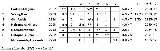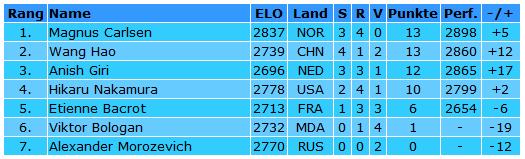 Leider musste Morozevich nach zwei Runden aus gesundheitlichen Gründen das Turnier verlassen. Seinen Platz nahm Viktor Bologan ein.