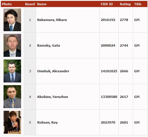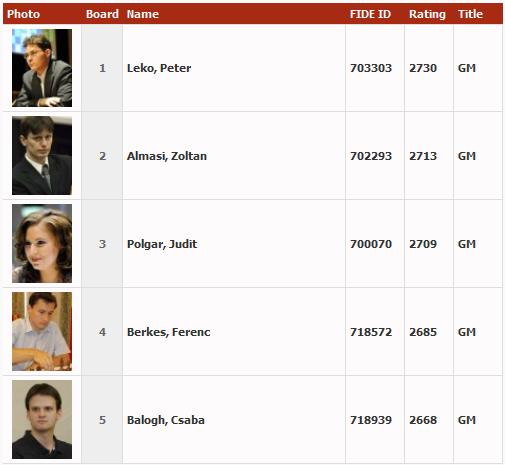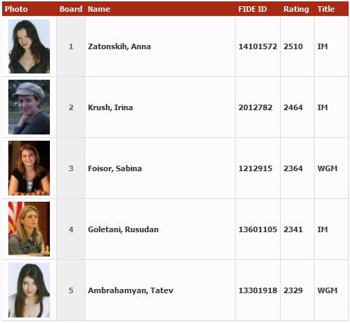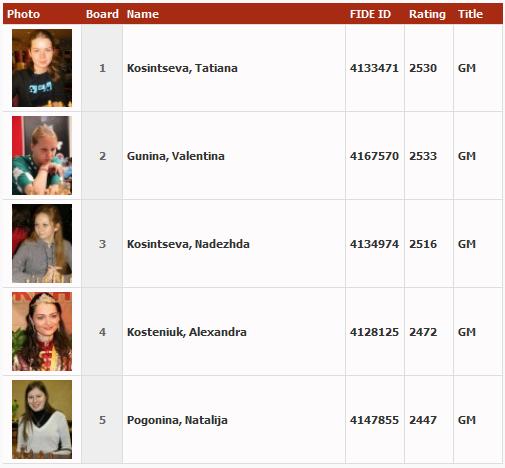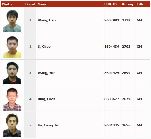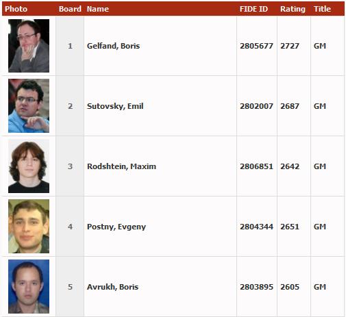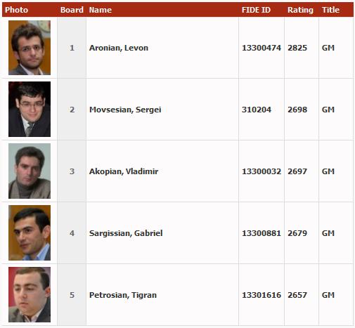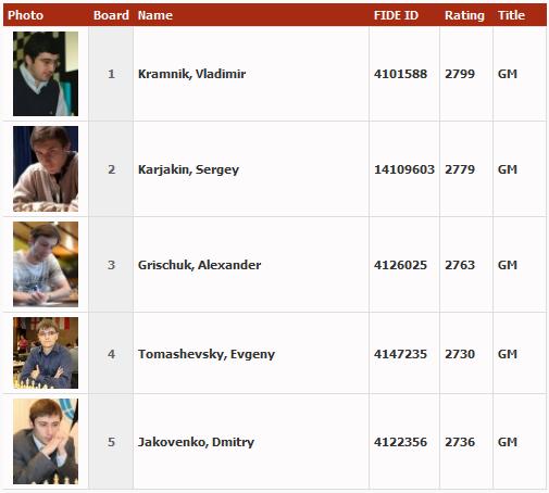 ...bietet ein breit gefächertes Feld an Favoriten, wobei Russland, Titelverteidiger Ukraine, Armenien, Aserbaidschan, China, USA, Israel und auch Ungarn nach Ansicht des Autors zu den heißesten Medaillen-Anwärtern zählen dürften. Immerhin, das sind ja schon mal acht Teams, welche wir Ihnen gerne auch nochmals mit Namen und Zahlen vorstellen möchten. Stören Sie sich nicht an der teils abenteuerlichen und mitunter fehlerhaften Schreibweise einiger Namen! Die Screenshots stammen von der türkischen Veranstalterseite, und bei so vielen Namen und Daten kann dies natürlich passieren. Auch sind die Ratingzahlen nicht wirklich aktuell, aber bei der Olympiade werden garantiert die korrekten Zahlen verwendet.
