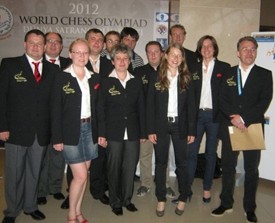 Die deutsche Delegation. Vorne von links nach rechts: Daniel Fridman, Elena Levushkina, Tatyana Melamed, Arkadij Naiditsch, Melanie Ohme, Marta Michna und Raj Tischbierek. Hinten von links nach rechts: Uwe Bönsch, Igor Khenkin, Georg Meier, Peter Heine-Nielsen und Jan Gustafsson. Peter Heine Nielsen ist natürlich kein Deutscher, sondern Däne, er begleitet die Mannschaft als Eröffnungstrainer. Weitere Mitglieder der deutschen Delegation sind Elisabeth Pähtz, die deutsche Nummer eins bei den Damen und Michael Prusikin, der die Damenmannschaft als Eröffnungstrainer betreut.