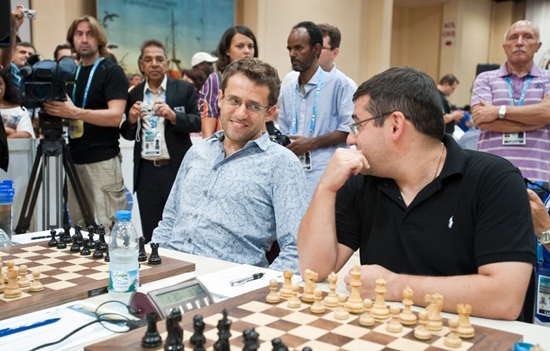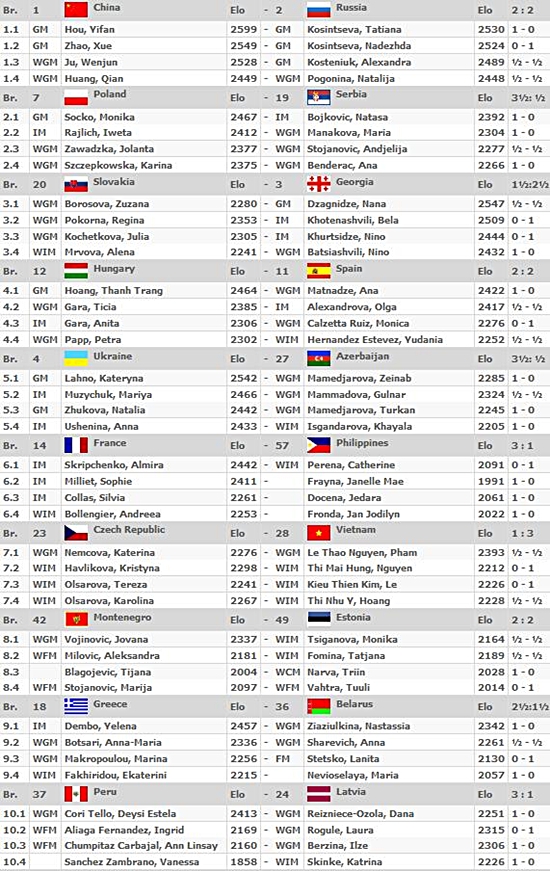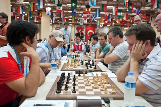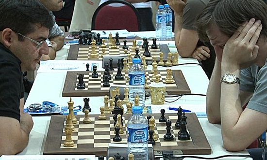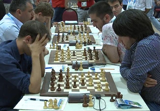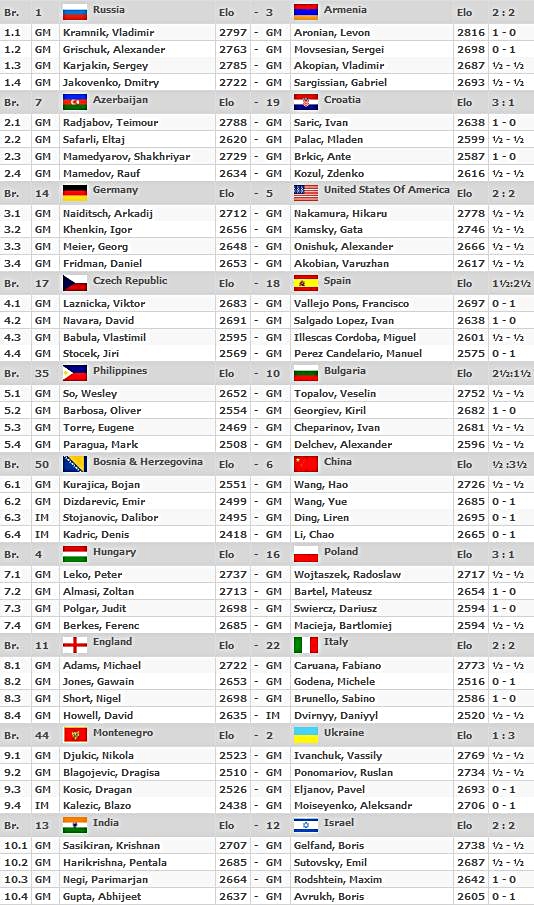 03.09.2012 - Im heutigen Spitzenduell der 40. Schacholympiade zwischen Russland und Armenien gab es keinen Sieger und damit auch keine (kleine) Vorentscheidung um Gold. Zwar legte Vladimir Kramnik gegen Levon Aronian aus russischer Sicht vor, doch Sergei Movsesian machte dies gegen Alexander Grischuk wieder wett. Die beiden anderen Partien endeten unentschieden. Da parallel Aserbaidschan gegen Kroatien mit 3:1 siegte, liegen nun drei Teams mit 11 Punkten gleichauf an der Spitze. Auch das deutsche Team ist im Open weiter ungeschlagen. Heute traf man auf die favorisierten US-Amerikaner und und trotzte diesen ein verdientes 2:2 ab, was zugleich bedeutet, dass man weiterhin in Tuchfühlung zu den Medaillenrängen ist. Die zweite Niederlage in Serie mussten hingegen die deutschen Frauen hinnehmen. Nominell war man den Inderinnen zwar nahezu ebenbürtig, doch auf den Brettern konnte man dies leider nicht bestätigen. Elisabeth Pähtz remisierte zunächst am Spitzenbrett, doch bald darauf musste Marta Michna aufgeben. Es folgte Tetyana Melamed mit einem weiteren Remis und zu schlechter Letzt musste Melanie Ohme ihre schlechte Stellung zum 1:3 Endstand aufgeben. Im Spitzenduell zwischen den Russinnen und den Chinesinnen gab es keinen Sieger. Die Niederlage von Tatiana Kosintseva am Spitzenbrett gegen Hou Yifan, glich die Schwester Nadezda gegen Zhao Xue wieder aus. UPDATE: Im Open kommt es an der Spitze zu den Duellen Aserbaidschan gegen Russland und China gegen Armenien. Die deutschen Mannen werden sich mit Moldawien messen, während die Frauen mit Syrien einen Gegner haben, den man schlichtweg schlagen MUSS.