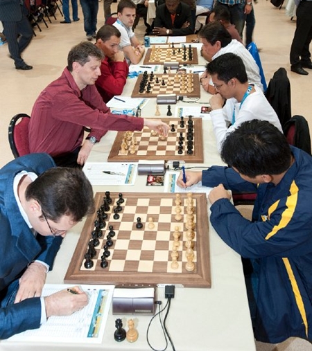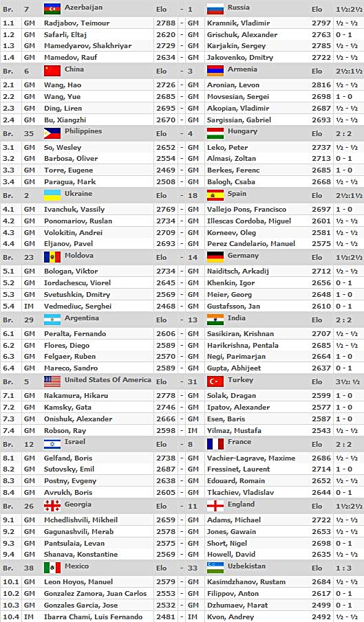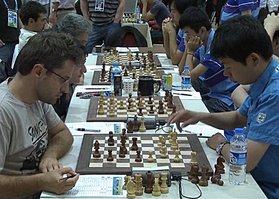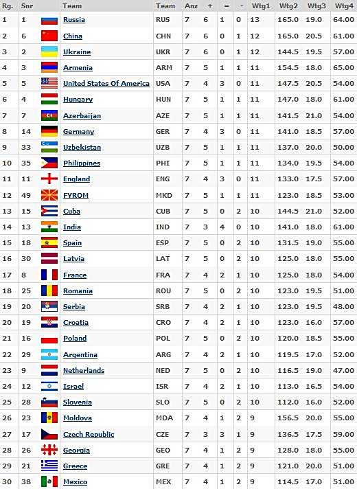 04.09.2012 - Alexander Grischuk ist der Matchwinner der 7. Runde bei der 40. Schacholympiade in Istanbul. Während seine russischen Kollegen allesamt gegen Aserbaidschan remisierten, konnte er gegen Eltaj Safarli siegen und so sein Team zur alleinigen Führung verhelfen. Parallel unterlag nämlich Armenien gegen China mit 1,5:2,5. Sehr frohe Kunde gibt es von den beiden deutschen Mannschaften zu vermelden. Im Open gaben die Mannen von Kapitän Uwe Bönsch Moldawien mit 2,5:1,5 das Nachsehen. Arkadij Naiditsch teilte mit Viktor Bologan den Punkt, und Georg Meier unterlag Dmitry Svetushkin, doch Jan Gustafsson schlug umgehend gegen Serghei Vedmediuc zurück, bevor Igor Khenkin gegen Viorel Iordachescu entscheidend vollstreckte. Die Frauen waren gegen Syrien haushoher Favorit und nutzten dies auch zu einem klaren 4:0. Mit einem blauen Auge kamen an der Tabellenspitze die Russinnen beim 2:2 gegen Polen davon. Immerhin zog China so per Sieg gegen Georgien nach Punkten wieder gleich. UPDATE: Die deutschen Männer treffen in der achten Runde auf die starken, aber nicht unbesiegbaren Ungarn. Die deutschen Frauen erhalten die Möglichkeit, es besser als die männlichen Kollegen zu machen, denn sie treffen auf Montenegro und sind erneut klare Favoritinnen.
