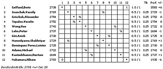 21.09.2012 - Heute war der Auftakt der jüngsten FIDE Grand Prix-Serie in London. Bis zum 04. Oktober werden sich zwölf absolute Könner des königlichen Spiels in einem Rundenturnier messen und um die 170.000 Euro Preisgeld sowie Grand Prix-Punkte ringen. Den besten Start erwischte der amtierende Vize-Weltmeister Boris Gelfand mit einem blitzsauberen Schwarzsieg im Sveshnikov gegen Hikaru Nakamura. Und da alle anderen Begegnungen - teils nach verbissenem Kampf - im Remishafen endeten, führt der Israeli alleine die Tabelle an. Die zweite Runde beginnt am Samstag um 15 Uhr unserer Zeit.