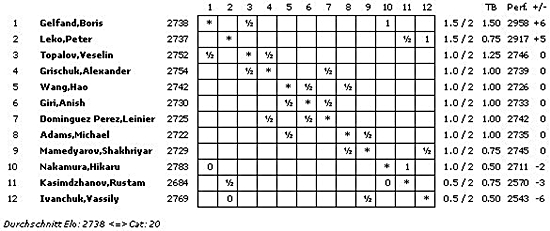 22.09.2012 - Nach der zweiten Runde des London Grand Prix führen Boris Gelfand und Peter Leko mit 1,5 Punkten die Tabelle an. Während der Israeli heute gegen Veselin Topalov remisierte, konnte der Ungar Vassily Ivanchuk im Endspiel überlisten und so gleichziehen. Den zweiten Sieg des Tages landete Hikaru Nakamura gegen Rustam Kasimdzhanov. Erst hatte es so ausgesehen, als hätte der Usbeke Vorteile gegen den Königsinder des Amerikaners, aber nicht zum ersten Mal bewies Nakamura, dass er in dieser Verteidigung ein wahrer Künstler ist. Schließlich geriet Kasimdzhanov vor der zweiten Zeitkontrolle in arge Zeitnot und übersah ein zweizügiges Matt. Die dritte Runde beginnt am Sonntag wie gewohnt um 15 Uhr.