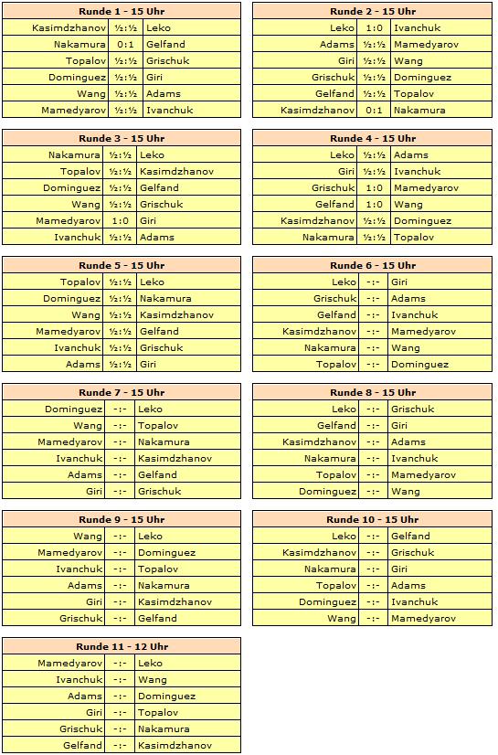 25.09.2012 - In der fünften Runde des FIDE Grand Prix ist absolut kein Blut geflossen. Alle Partien endeten, trotz teils verheißungsvollen Stellungen, im Remishafen und schraubten die Quote der unentschiedenen Partien auf schwindelerregende 80 Prozent hoch. Somit hat sich natürlich auch nicht in der Tabelle geändert. Es führt weiterhin Boris Gelfand mit einem halben Zähler Vorsprung vor Alexander Grischuk und Peter Leko. Am Mittwoch ist der erste von zwei Ruhetagen, bevor es am Donnerstag um 15 Uhr mit der sechsten Runde weitergeht.