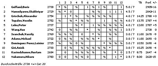 Rustam Kasimdzhanov brachte Vassily Ivanchuk bereits ganz früh in Bedrängnis, traute sich aber nicht, der Zugwiederholung auszuweichen. Und so steht unter dem Strich ein unbefriedigendes Remis nach nur elf Zügen!