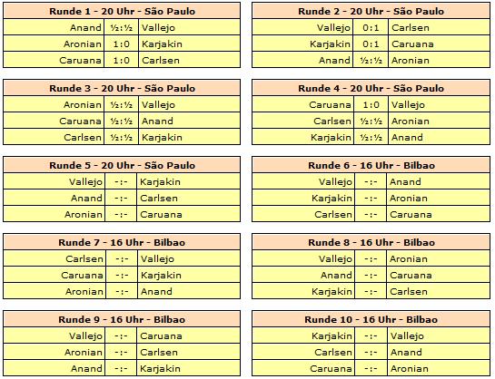 Rundenstart in São Paulo ist jeweils 20:00 Uhr unserer Zeit. Am 27. September wird ein Ruhetag eingelegt. In Bilbao dann wird jeweils um 16:00 Uhr gespielt. Am 11. Oktober wird geruht.