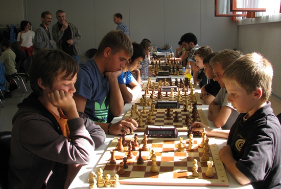 02.10.2012 - Die Main-Taunus-Schachjugend suchte am 30.09.2012 in der Flörsheimer Stadthalle ihre Bezirks-Mannschaftsmeister im Blitzen. In der Jugend (U20) waren 3 Mannschaften und bei den Schülern (U14) 5 Mannschaften am Start, so dass nach kurzer Beratung entschieden wurde, dass alle in einer Gruppe spielen mit einer Bedenkzeit von 4min + 2s pro Zug. Der Vorsitzende der MTSJ, Alexander Matzies, und der Vorsitzende des gastgebenden Vereins SC Flörsheim 1921, Wolfgang Ruppert, schafften dann schnellstmöglich Ruhe, indem Sie das Turnier starteten. Die Bandbreite der Teilnehmer von 6 - 20 Jahren ergab schon ein lustiges Bild - hier spielten Schulanfänger mit Fast-Erwachsenen in einer Meisterschaft - beim Schach kommt es halt nur auf Können und Leistung an! Auffallend war auch, dass aus lediglich vier Vereinen der MTS, der SC Flörsheim, SV Raunhem, SC Frankfurt-West und SC Bad Soden mit jeweils zwei Teams vertreten waren. Den teilnehmenden Kindern war das allerdings völlig "Wurscht", denn sie wollen einfach Schachspielen und möglichst viele Partien gewinnen. Dass die Kleinsten aus Bad Soden 1 mit einer U12/U10-Mannschaft antraten, fiel nicht weiter auf, weil sie in der 1. Runde gegen Bad Soden 2 ein etwas enttäuschendes 2:2 erzielten, aber als nach zwei 4:0-Siegen in der 4. Runde die Favoriten der U20 vom SV Raunheim nur glücklich dem Spielwitz der jungen Bad Sodener widerstanden, scharten sich mehr und mehr die Kiebitze an ihren Brettern. Sie ließen dann in den drei Schlussrunden noch 3 sichere Siege folgen und beendeten ihr erstes Mannschaftsturnier ungeschlagen mit 5 Siegen und 2 Unentschieden. Den Schüler-Pokal der U14 nahmen sie mit nach Hause und der Jugend-Pokal der U20 war ganz nah ... träumen erlaubt!