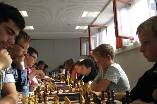 Das Mädchen vom SC Frankfurt-West zeigte sich nicht nur adrett und fotogen, sondern auch sehr schlagfertig und spielerisch geschickt am Schachbrett - das ist sicher ein Talent mit Potenzial? Schauen Sie sich die weißen Läuferstellungen im nächsten Bild gegen Tim Wagner spielend einmal genau an!