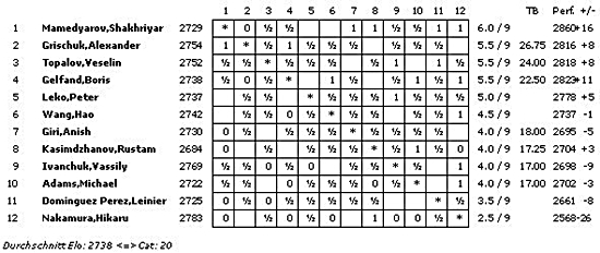 01.10.2012 - Alexander Grischuk hat den laufenden FIDE Grand Prix in London wieder so richtig spannend gemacht. In der heutigen neunten Runde überspielte er aus der Eröffnung heraus Boris Gelfand und zog so nach Punkten gleich mit dem Israeli. Doch sie führen nicht, denn parallel gewann Shakhriyar Mamedyarov sein Endspiel mit Läuferpaar gegen Springerpaar gegen Leinier Dominguez und hat nun einen halben Punkt mehr auf dem Konto als Gelfand, Grischuk und ... Veselin Topalov! Ja, auch der Bulgare ist wieder dick im Rennen um den Turniersieg, nachdem er heute Vassily Ivanchuk niederringen konnte. Und wer den Schaden hat, braucht ja bekanntlich nicht für den Spott sorgen - das gilt auch für Hikaru Nakamura. Nach zuletzt drei Niederlagen en suite übertrieb es der Amerikaner heute im Duell mit Michael Adams vollends und wurde von dem Briten fachgerecht verarztet. Dass vier Niederlagen in Serie in Fachkreisen als "Audi" bezeichnet werden, ist sicherlich auch Naka bekannt und wusste er bisher nicht, wie sich das anfühlt, nun weiß er es! Nur zwei Partien fanden heute keinen Sieger. Wang Hao gegen Peter Leko und Anish Giri gegen Rustam Kasimdzhanov endete jeweils friedlich. Am Dienstag geht es um 15 Uhr in die vorletzte Runde.