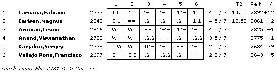 TopTurniere Grand Slam - Caruana und Carlsen führen nun gemeinsam Hochspannung für die letzten drei Runden Ruhetag am MITTWOCH!