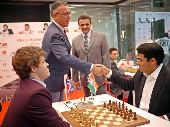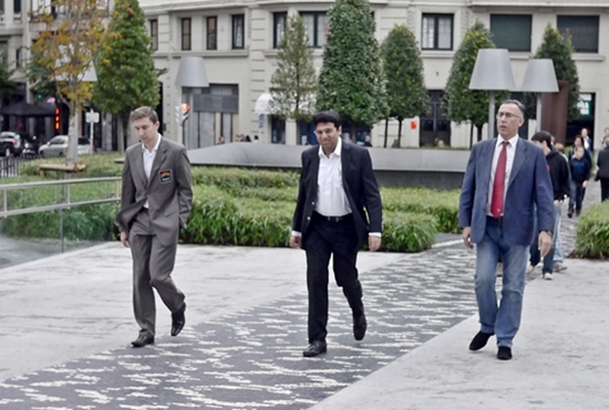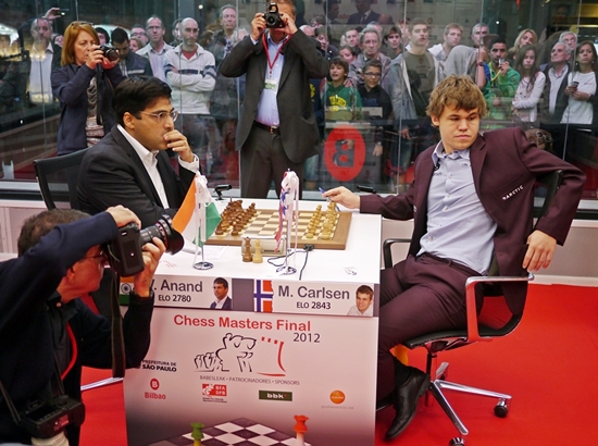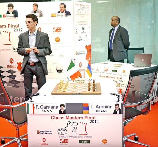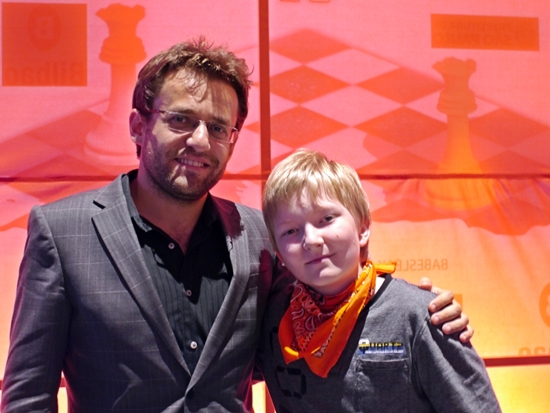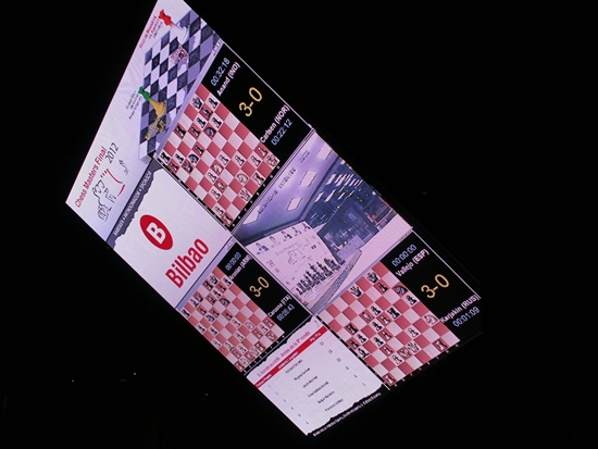 12.10.2012 - Die neunte Runde beim Grand Slam Masters Final in Bilbao sah heute alle drei Anziehenden klar im Vorteil. Den Anfang machte Magnus Carlsen mit seinem sehenswerten Sieg gegen Weltmeister Viswanathan Anand. Damit brachte der Norweger Co-Leader Fabiano Caruana quasi in Zugzwang, doch dieser ließ sich nicht lumpen und besiegte Levon Aronian. Damit haben Carlsen und Caruana vor der Schlussrunde jeweils 16 Punkte und können von der übrigen Konkurrenz nicht mehr eingeholt werden. Das vermeintlich leichtere Los hat zum Abschluss der Italiener, denn er trifft auf Francisco Vallejo, der heute Sergey Karjakin unterlag. Carlsen bekommt es mit Aronian zu tun. Die letzte Runde beginnt bereits um 16:30 Uhr. Unser heutiger Bericht wird mit zahlreichen Bildern unseres Chess Tigers on Tour Eric van Reem garniert.