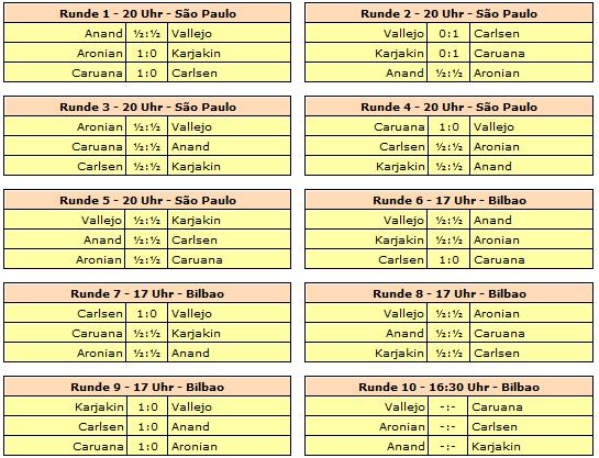 Rundenstart in São Paulo ist jeweils 20:00 Uhr unserer Zeit. Am 27. September wird ein Ruhetag eingelegt. In Bilbao dann wird jeweils um 17:00 Uhr gespielt, nur die letzte Runde wird bereits um 16:30 gestartet. Am 10. Oktober wird geruht.