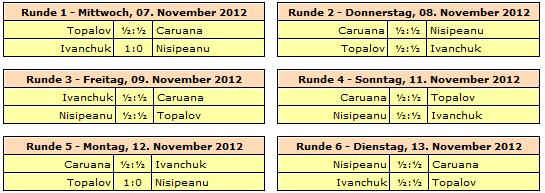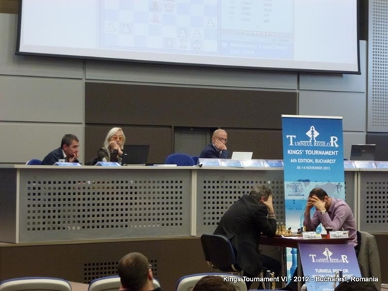 13.11.2012 - Eigentlich hätte die sechste Auflage des Kings Tournament schon im Sommer unter anderem mit Weltmeister Viswanathan Anand und Magnus Carlsen stattfinden sollen, aber finanzielle Probleme seitens des Veranstalters vereitelten dieses Vorhaben. Nun wurde das Turnier vom 07. bis 13. November in Bukarest und mit deutlich abgespecktem Teilnehmerfeld nachgeholt. Am Start waren mit Fabiano Caruana, Vassily Ivanchuk, Veselin Topalov und Liviu-Dieter Nisipeanu lediglich vier Spieler. Und wie es so oft bei so wenigen Spielern vorkommt, war die Remisquote mit 83,3 Prozent extrem hoch. Lediglich zwei der zwölf Partien fanden einen Sieger. Leidtragender war jeweils Nisipeanu, welcher zunächst in Runde 1 Ivanchuk und in Runde 5 Topalov unterlegen war. Somit sahen die Regeln einen Tiebreak um dem Turniersieg vor. Gespielt wurden zwei Schnellpartien (15'+3''). Die erste Partie gewann Ivanchuk mit Schwarz trotz Minusbauer durch Zeitüberschreitung und in der zweiten erreichte er ein ungefährdetes Weißremis, welches ihn zum Turniersieger machte.