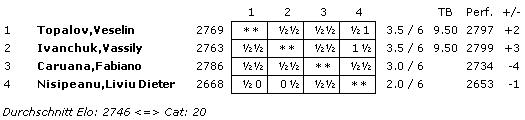 Mit einem ELO-Schnitt von 2746 wurde die Turnierkategorie 20 erreicht.
