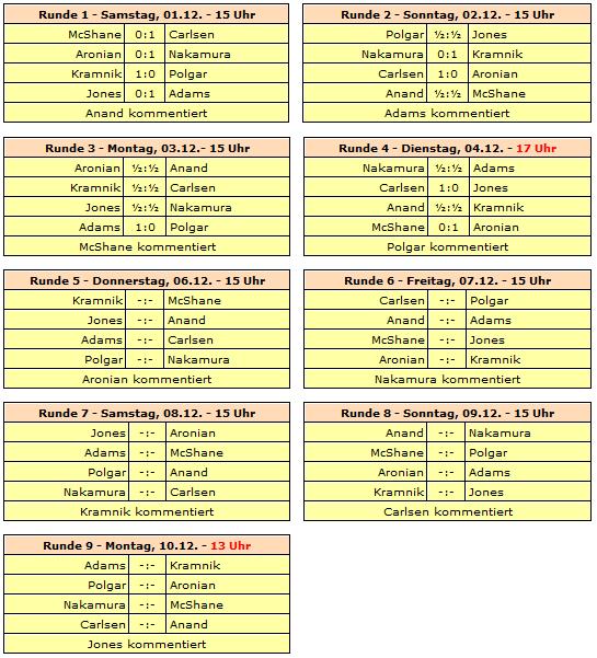 Rundenstart ist täglich um 15 Uhr unserer Zeit, lediglich in der vierten (17 Uhr) und neunten Runde (13 Uhr) ändert sich die Startzeit. Der einzige Ruhetag wird am 05. Dezember eingelegt.