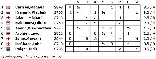 05.12.2012 - Auch die vierte Runde der 4. London Chess Classic bot erneut Schach vom Allerfeinsten. Über Allen thront mal wieder Magnus Carlsen. Der Norweger übernahm mit seinem "Pflichtsieg" über Gawain Jones die alleinige Führung und schickt sich nun endgültig an, die bisherige ELO-Bestmarke 2851 von Garry Kasparov zu pulverisieren. Aber auch Levon Aronian hatte gestern allen Grund zur Freude. Nach einem miserablen Start besiegte der Armenier in der spannendsten Partie der vierten Runde Luke McShane. Weltmeister Viswanathan Anand tat sein Bestes, um gegen Vladimir Kramniks Berliner Verteidigung eine spielbare Stellung zu erzeugen, was ihm auch gelang, aber der Russe errichtete dennoch eine undurchdringbare Mauer aus Bauern, und so musste sich der Inder erneut ins Remis fügen. Hikaru Nakamura legte seine Eröffnung gegen Michael Adams wieder sehr kreativ an, doch der Brite ließ sich nicht verwirren und hielt erfolgreich dagegen. Letztlich spielte man bis zu den blanken Königen. Heute dürfen sich die Spieler erholen, bevor am Donnerstag die fünfte Runde ansteht. Neben den schönen Bildern von Ray Morris-Hill hat unser Chess Tiger on Tour Eric van Reem ebenfalls ein paar exklusive Eindrücke geschickt. Viel Spaß beim Anschauen!