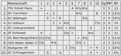 Nord: Hier bewerben sich noch 3 Klubs mit vollem Punktekonto um den Aufstieg in die Hessenliga. Niederbrechen auf Rang 3 ist dabei die Überraschung der Liga, und auch Wiesbaden an der Spitze nach Brettpunkten hätte man nicht unbedingt hier erwartet, da Korbach die Pfeile nicht im Köcher lässt, sondern die spielstarken GMs auch in die Aufstellung bringt. Das Spitzenduell um den Aufstieg steigt jedenfalls im Januar.