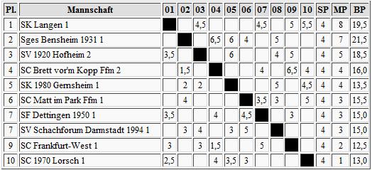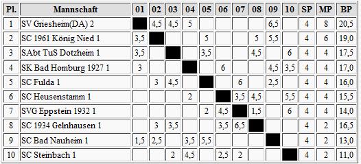 Wer soll denn Griesheims Zweiter eigentlich noch den Zugang zur Oberliga versperren? Bad Homburg jedenfalls nicht mehr. Gelnhausen, als mit DWZ-Vorschusslorbeeren bedachter Favorit, verlor jetzt auch den dritten von vier Wettkämpfen und verschaffte damit dem Gegner König Nied den direkten Verfolgerplatz. Heusenstamm musste nun auch gegen Eppstein eine Niederlage einstecken und findet sich mal wieder im breiten Mittelfeld zu Hause. Fulda schwächelte erneut, diesmal gegen Bad Nauheim, und wird auch gegen die Starkenburger an der Spitze nichts ausrichten können. Steinbach geht nach der dritten Niederlage in Serie wohl schon früh die Luft aus, wobei Dotzheim dieser Sieg gerade recht kam.