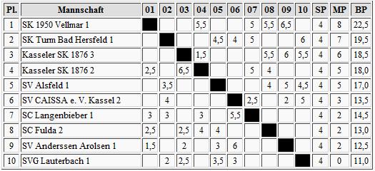 Unschlagbar ist bislang Vellmar im Norden, und dabei hat man den DWZ-Krösus, Kasseler SK 2, schon gehabt. Bad Hersfeld ist hier der engste Verfolger, und im Februar werden wir wissen, wie diese Spitzenpaarung ausgeht.