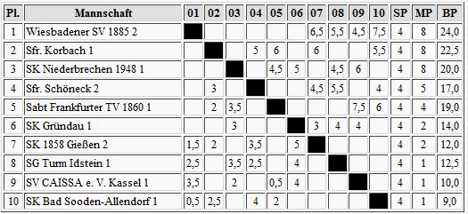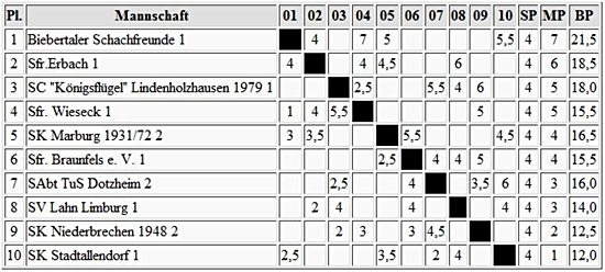 Eine Kopie der Ostgruppe finden wir im Westen: Biebertal führt mit einem bisher abgegebenen Punkt gegen den Zweiten Erbach, die schon ein weiteres Remis einfuhren.
