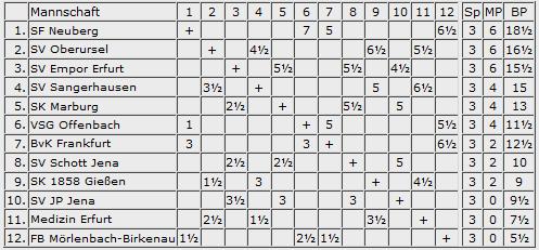 Offenbach, Oberursel und Neuberg sind schon mal die ersten Sieger der 4.Runde in der Oberliga, denn der Spielplan bescherte ein Heimspiel für den kommenden Sonntag. Mörlenbach und BvK Frankfurt müssen nach Erfurt, Giessen nach Jena. An der Spitze nach der dritten Runde: Neuberg vor Oberursel und Empor Erfurt. Und Mörlenbach mit drei Niederlagen das Schlusslicht; das hätte möglicherweise gute Wettquoten gegeben.
