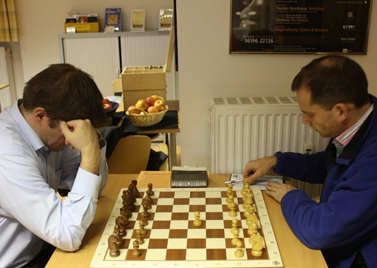 Papa Andreas Weber (links) erreichte mit Geschick und etwas Glück ein Remis gegen Michael Budde und gewann die Ratinglasse 2