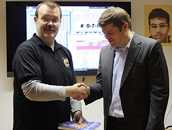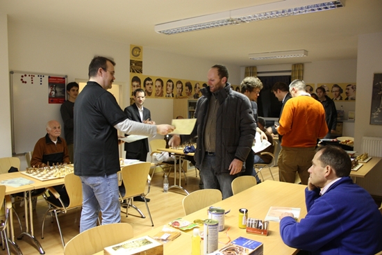 Für seine Partie gegen Johannes Kribben gewann FM Michael Stockmann den Preis für die "Partie des Turniers". Na ja, das Los wollte es so, obwohl viele Teilnehmer einen anderen Favoriten hatten. Und so machte auch Stocki gute Miene...