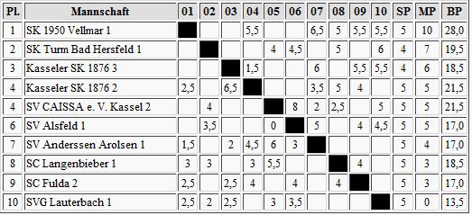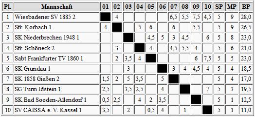 Fast zwei Monate sind vergangen seit der letzten Verbandsrunde, aber die Spieler von Tabellenführer Griesheim haben nichts verlernt. Knapp ging's aus gegen Fulda, doch die zwei Punkte klingeln erst mal in der Tabellenkasse. Nied hält nach dem Derby-Sieg gegen Steinbach den Anschluss, doch es bleibt nur die Hoffnung auf einen Ausrutscher des Ersten. Bad Homburg und Heusenstamm haben nüchtern betrachtet erst mal nur den abstiegsbedrohten Rest separiert, denn ab Platz 5 ist man nur 2 Punkte vom Tabellenende entfernt. Schafft es Steinbach doch noch, die rote Laterne abzugeben?