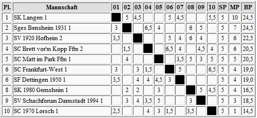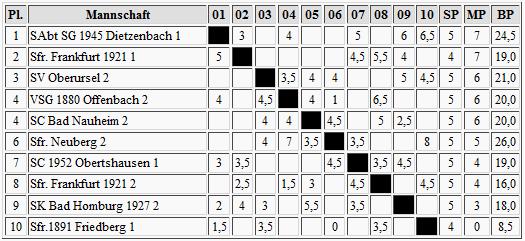 Zu ihm an die Spitze gesellte sich so noch Thomas Renner vom SV Frankfurt Nord, der in der Schlußrunde überraschend gegen IM Boris Margolin vom SV Oberursel gewinnen konnte, und diesen damit auf Platz 6 verwies. Renner wurde damit auch Bester des Bezirks Frankfurt!
