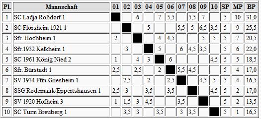Flörsheim hat zwar als aktuell Zweiter noch das Vergnügen gegen den Tabellenführer antreten zu können und damit selbst die Spitze zu erklimmen, doch ob das die Roßdorfer auch wollen? Na, ich tippe mal auf zwei weitere Runden im Gleichschritt und dann werden wir wissen, wer Meister im Süden wird.