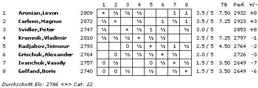 20.03.2013 - Man, man, das war eine wirklich tolle fünfte Runde beim Kandidatenturnier in London! In allen vier Partien ging früher oder später mächtig die Post ab, und es hätte gut und gerne ohne ein einziges Remis enden können. Doch der Reihe nach: Zwischen Peter Svidler und Boris Gelfand wurde es schon aus der Eröffnung heraus heiß. Der Israeli wagte es tatsächlich, als Schwarzer die Leib und Magen-Eröffnung seines Gegners - Grünfeldindisch - zu spielen und geriet in Rekordzeit in Nachteil. Doch in der Folge verbrauchte Svidler nach eigener Aussage an den falschen Stellen zu viel Zeit und verlor dann den Faden. Nach dem Friedensschluss haderte der St. Petersburger sehr mit seinen vergebenen Chancen. Auch bei Vassily Ivanchuk gegen Magnus Carlsen kam Weiß bestens aus der Eröffnung, doch Chucky kann momentan offenbar nicht mit der Bedenkzeit umgehen und schenkte seinen Vorteil in Zeitnot wieder her. Als Carlsen kurz vor der ersten Zeitkontrolle gar noch das Remisangebot ablehnte, schlug er beinahe dem Fass den Boden aus. Dafür kritisierte sich der Norweger in der Pressekonferenz selbst sehr heftig, denn so hätte er sich einen unnötigen Kampf um den halben Punkt ersparen können. Kein Bisschen weniger spannend war das Remis zwischen Vladimir Kramnik und Levon Aronian. Im Mittelspiel erspielte sich der Russe großen Vorteil, übersah dann jedoch einen guten Gewinnweg, und Aronian konnte ausgleichen. Doch der Armenier machte es nochmals spannend und musste schließlich seine ganzen Verteidigungskünste bemühen, um wirklich ins Remis zu entkommen. Last but not least trennten sich Alexander Grischuk und Teimour Radjabov ohne einen Sieger. Der Aseri gab - nachdem er zwischenzeitlich mal kritisch stand - eine Figur für drei Bauern und spielte damit auf Sieg, doch sein russischer Gegenüber fand den schmalen Grat zur Punktteilung. Somit hat sich trotz einer klasse Runde natürlich nichts am Tabellenstand geändert. Die sechste Runde findet am Donnerstag um 15 Uhr statt.