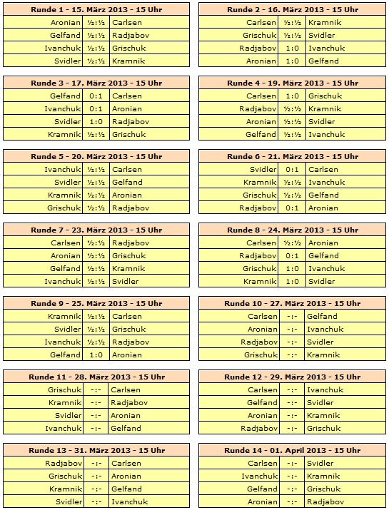 TopTurniere Candidates 2013 - Carlsen erstmals alleine vorn Ruhetag am Dienstag