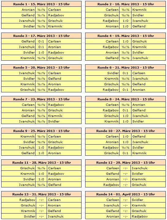 TopTurniere Candidates 2013 - Carlsen remis, Kramnik siegt, Aronian verliert Noch ist alles möglich!