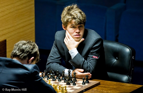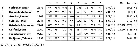 28.03.2013 - Gegen Alexander Grischuks originelle Eröffnungsbehandlung glich Magnus Carlsen mit Schwarz in der elften Runde des Kandidatenturniers zwar aus, aber mehr rechnete sich der Führende nicht aus, und so ward nach 23 Zügen der Punkt geteilt. Damit behält Carlsen mit 7,5 Punkten die alleinige Führung, doch der direkte Verfolger hat sich geändert. Vladimir Kramnik stellte Teimour Radjabov eine taktische Falle und der völlig außer Form agierende Aseri tappte voll hinein. Damit hat Kramnik 7 Punkte, während Levon Aronian dieses Mal deutlich zu viel Risiko gegen Peter Svidler einging und von dem Russen folgerichtig bestraft wurde. Dennoch ist der Armenier mit 6,5 Punkten und drei ausstehenden Runden noch nicht gänzlich aus dem Rennen. Die morgige Begegnung mit Kramnik könnte aus dem Dreikampf an der Spitze ein Duell machen. Nicht der Rede wert war übrigens das Remis zwischen Vassily Ivanchuk und Boris Gelfand nach nur 17 Zügen. Freuen wir uns lieber auf die zwölfte Runde am Karfreitag - wie gewöhnlich ab 15 Uhr.
