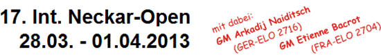 Das 17. Int. Neckar-Open sah nach der 9. Runde ein totes Rennen. Gleich 13 Spieler teilen sich mit 7,0 Punkten den 1. Platz. Der glückliche Sieger nach Wertung heißt Richard Rapport. Der 17-jährige Ungar ist ein verdienter Sieger, denn er spielte ein sehr souveränes Turnier ohne ein Mal in Verlustgefahr zu geraten. Auf den 2. Platz landete Etienne Bacrot vor Yuri Solovnichenko.
