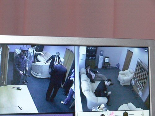 Ein Schnappschuss des Überwachungsmonitors der beiden Ruheräume - links Vladimir Kramnik und rechts Veselin Topalov