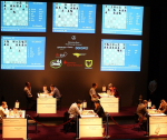23.07.2010 - Auch nach der siebten Runde führt Ruslan Ponomariov weiterhin alleine die Tabelle des Sparkassen Chess-Meetings an. Während der Ukrainer aktuell mehr darauf bedacht ist, nicht zu verlieren, stiehlt ihm ein Kollege etwas die Show. Würde es eine Wertung für den kämpferischsten Spieler geben, Shakhriyar Mamedyarov würde sie zweifelsohne gewinnen. Lediglich zwei seiner Partien endeten bisher unentschieden, allerdings reicht das für den Aseri (noch) nicht, um die Führung zu übernehmen, denn bei drei Siegen stehen bei ihm eben auch zwei Niederlagen zu Buche. Gestern wurde Ehrengast Anatoly Karpov Zeuge, wie Mamedyarov gegen Peter Leko siegte, doch dieser glaubt, dass sich letztlich Ponomariov durchsetzen wird. Zeitgleich mit dem zwölften startete gestern eine Delegation der Chess Tigers dem stärksten GM-Turnier Deutschlands einen Besuch ab und war auch dabei, als der Kandidat für das Amt des FIDE Präsidenten in einer Pressekonferenz für seine Wahl-Kampagne warb. Nach wie vor sind er und sein geplanter Vize Richard A. Conn Jr. aus den USA optimistisch, Kirsan Ilyiumzhinov vom Thron stoßen zu können. Tabelle, Partien und viele Bilder ...