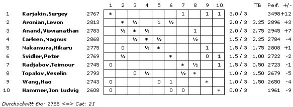 Mit einem ELO-Schnitt von 2766 wird die Turnierkategorie 21 erreicht.