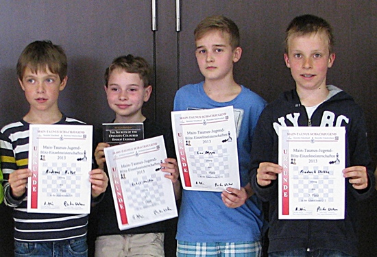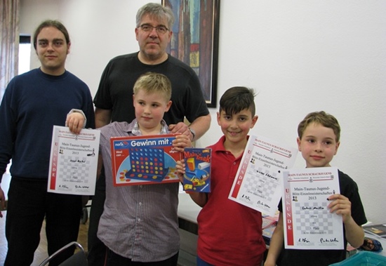 Andreas Haller (U8 Bronce) / Lukas Martin (U10 Gold) / Leo Max Deppe (U14 Gold) / Frederik Stobbe (U12 Bronce) - letztes Jahr im November 2012 war die Ausbeute noch mit 2./3./3./4.Platz noch etwas dürftig, im Blitzen sieht das mit 1./1./3./3.Platz schon ein bisschen besser aus - weiter so!!
