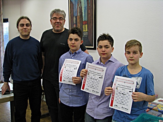 Auf den Medaillenränge: Leon Hollmann (Hofheim 13,0/14 Gold) Lars Lange (Kelkheim 10,5/14 Silber) Frederik Stobbe (Bad Soden 10,0/14 Bronce)
