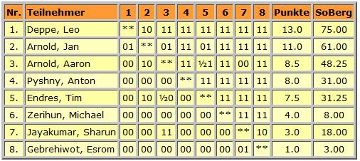 Endlich war es so weit, zum ersten Mal durften vier Neulinge aus der Chess Tigers Talentförderung für den SC Bad Soden an der Blitz-Jugend-Bezirksmeisterschaft der Main-Taunus-Schachvereinigung teilnehmen. Die zehn Jungs aus der Trainingsgruppe GS2, GS4 und den Schach AGs der Geschwister-Scholl-Schule in Schwalbach am Taunus waren von der U8 (unter 8 Jahre) über die U10, die U12 und die U14 verteilt. Hier hatte es der Trainer leicht, denn die Jahrgangsdaten entschieden und so wurde auch ohne Ausnahme zugeordnet. Die Fachleute glaubten sogar, dass die U12 die nominell stärkeren Teilnehmer hatte als die U14 - Leo Max Deppe vom SC Bad Soden musste da schon ordentlich Leistung bringen, damit er auch seine Anerkennung fand trotz eines hohen Scors von 13 Punkten aus 14 Partien. Gleichermaßen musste auch der neue U10-Meister Lukas Martin alle seine Kräfte und Konzentration aufbringen, um mit 12/12 Punkten den starken Josef Gertel 11/12 vom SC Frankfurt-West niederzuhalten. Aber was sollte er machen, mehr als 100% geht nicht, auch wenn einige Kollegen mit ihren gutspielenden Schützlingen trotz dieser gigantischen Scors haderten. Im Übrigen ist der Schreiber dieser Zeilen sehr zu frieden mit den Leistungen seiner Schützlinge aus Bad Soden und seines Stammvereins SC Frankfurt-West, die von Markus Busche betreut werden. Weiter so Jungs, Wettbewerb belebt das Geschäft, aber auch die Kinder des SV Griesheim lieferten Großartiges ab - Glückwunsch an die aktiven Michael Schimmer und Ralph Bluhm, die die Kinder so gut fördern. Griesheim und West hatten im Bereich Ü14 überall die Nase vorn, wobei auch beide Vereine über gute Mädchen im U14-Bereich verfügen. Natürlich gilt der Dank allen Vereinen, die die jungen Nachwuchsspieler - unsere Rentenversicherung - aufopferungsvoll fördern und begleiten.