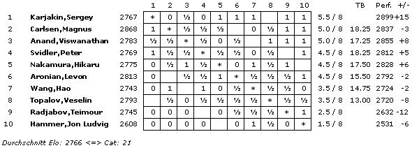 Mit einem ELO-Schnitt von 2766 wird die Turnierkategorie 21 erreicht.