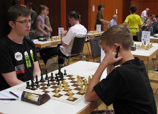 ... höher, weiter, schneller, ... Jungs wollen sich immer wieder messen, am liebsten jeden Tag, jede Stunde. Nicht nur in jeder Partie, sondern auch in jeder Pause oder der generellen Wartezeit zwischen den einzelnen Runden. Manchmal kommt mit dem Tandemspielen oder anderen Entspannungsformen des Schachs der kurze Eindruck auf, dass das gescheiteste Spiel auf diesem Globus auch ein bisschen Zeitvertreib bedeutet, aber nicht wirklich, bemerkt der interessierte Beobachter nach kurzem Hinhören: "Hau den Springer raus - ich brauch' einen Bauer - stell Dich nicht so an - mach schon - die Uhr tickt - wir verlieren auf Zeit - noch einen Springer sofort und er ist matt". Das Wettkampffieber ist auch zwischen den Runden deutlich spürbar. Schaut man in die Kinderaugen, dann kann man die Neugierde auf die nächste Partie lesen. Wann gehts endlich los! Doch es gibt auch schon die erfahrenen Cracks unter den 8- und 10-Jährigen - nichts scheint unbeliebter bei den erwachsenen Spielern zu sein, als die Begegnung mit einem unbekannten kleinen menschlichen Wesen. Jahrgang 2004, DWZ 1861 und 2 Punkte aus 2 Partien im A-Turnier - das ist schon eine undankbare Aufgabe für einen 2200er in der 3.Runde. Wie soll man sich da auf den "Zwerg" einstellen, wie soll man da dem unbekannten "Schachgenie" begegnen? Hauptvarianten oder unbekannte zweischneidige Nebenvarianten, Tretminen legen oder still kommentieren: "Na, hat Dein Trainer Dir das schon gezeigt?" ... und dann gibt es noch die schönen Begegnungen bei den Schülern zwischen beiden Geschlechter und Remisangebote in geschliffenen ganzen Sätzen: "Ich biete Dir remis an" und "Ich lehne Dein Remisangebot ab". Herrlich, dreimal dürfen Sie raten, wer wem hier ein Remisangebot in objektiv schlechterer Stellung machte und wer es zurückgewiesen hat! Mädchen oder Junge?
