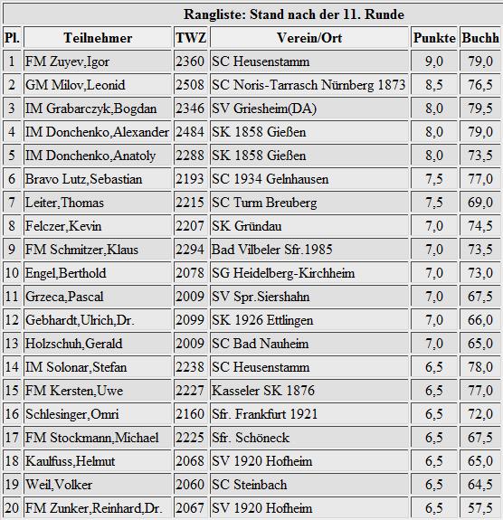 Ein zweites Mal hatten es zuvor bereits die Großmeister Khenkin, Meijers und Milov geschafft, aber der diesjährige Sieger, der sich ebenfalls nun zu diesen dazugesellt, hätte Dir so richtig gefallen: FM Igor Zuyev vom SC Heusenstamm. GM Milov, den Schachprinzen Alexander nebst Vater IM Donchenko und auch IM Grabarczyk, alle hat er hinter sich gelassen und mit einem halben Punkt Vorsprung gewonnen. Er blieb als einziger ungeschlagen!
