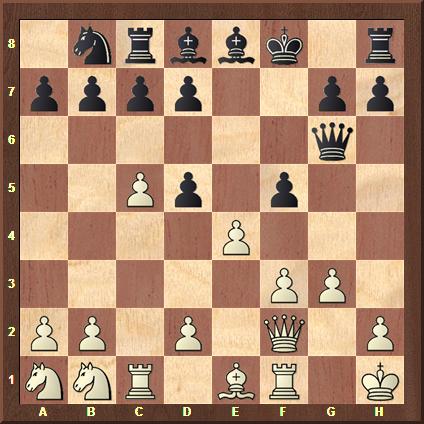 1.f3 Zuerst Läufer- und Damediagonale frei machen zur Entwicklung der Figuren bei gleichzeitiger Attacke auf den Bauer a7. Der stärkste Eröffnungszug laut Fritz13 ist 1.Sb3 +0,21!, gefolgt von 1.f4 +0,17! 1...Sb6 Der 12–Jährige antwortet mit der Entwicklung des Eckspringers bei gleichzeitiger Verteidigung des Bauers und Ausgleich! 2.c4 f5 Sehr aktiv! 3.c5 Sd5 Weiß treibt den ehemaligen Eckspringer ins Zentrum! 4.Df2 Df7 5.0–0 Sf4