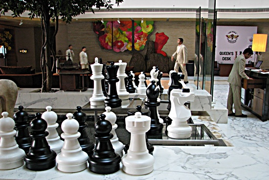 Das Hyatt Regency mit seinen zehn Etagen und seinem 5 Sterne-Ambiente, hervorragendem Fitness-Center, großem Schwimmbad im Freien und drei sehr guten Restaurants, einem indischen, einem italienischen und einem chinesischen bietet alles vom Feinsten, um sich Wohlfühlen zu können. Doch heute war im Hotel Business angesagt. Alle Gäste schienen im letzten Moment vor der morgigen Eröffnung anzureisen und in der Konferenzebene wurden gleichzeitig an vielen Stellen der Spielsaal, der Pressesaal, das Pressezentrum und alle Werbeflächen im und außerhalb des Hotels realisiert. Heute Abend schien der Aufbau bis auf wenige Kleinigkeiten abgeschlossen zu sein, den sich wie Ameisen bewegenden Indern zollen wir als erfahrener Organisator der Schachgroßveranstaltung Chess Classic höchsten Respekt, auch wir setzten bis zu 64 fleißige Helfer gleichzeitig ein! Machen Sie mit uns einen Streifzug durch das Hyatt Regency in Chennai und machen Sie sich selbst ein Bild vom Austragungsort. Wir finden es große Klasse, was in diesem Hotel geschieht!