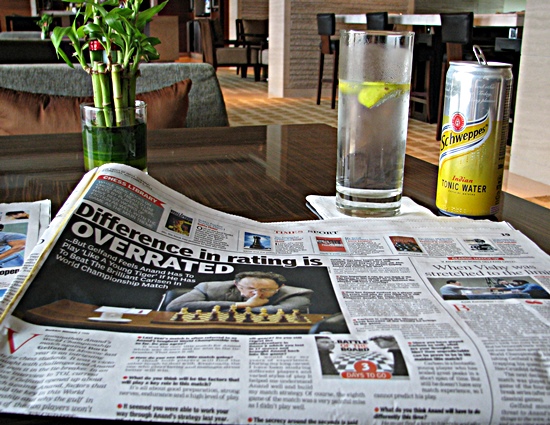 Anand-Team Völlig entspannt: Delegationleiter HWS beim Studium der indischen Zeitungen und Indian (Gin) Tonic Water